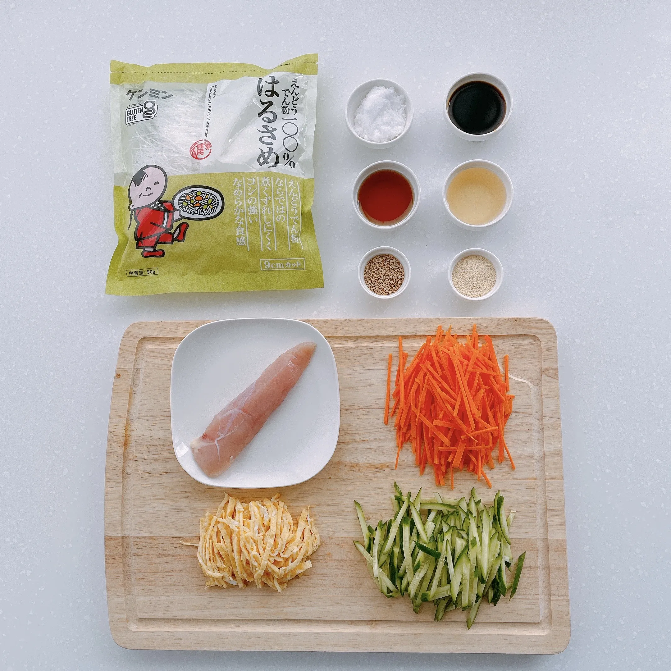 お湯を沸かし、はるさめを7分ゆでる。 鶏ささみもはるさめと一緒にゆでて火を通す。