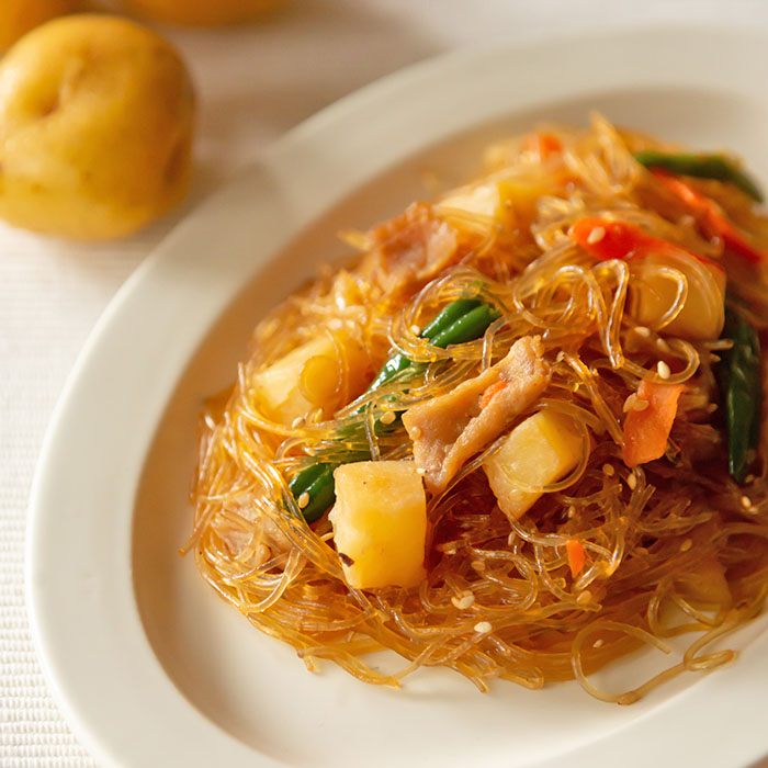 じゃがいもと豚肉をはるさめと甘く炒めました。なめらかな口当たりとコシをあわせ持った独特の食感が特徴のタイ産はるさめを使用しています。