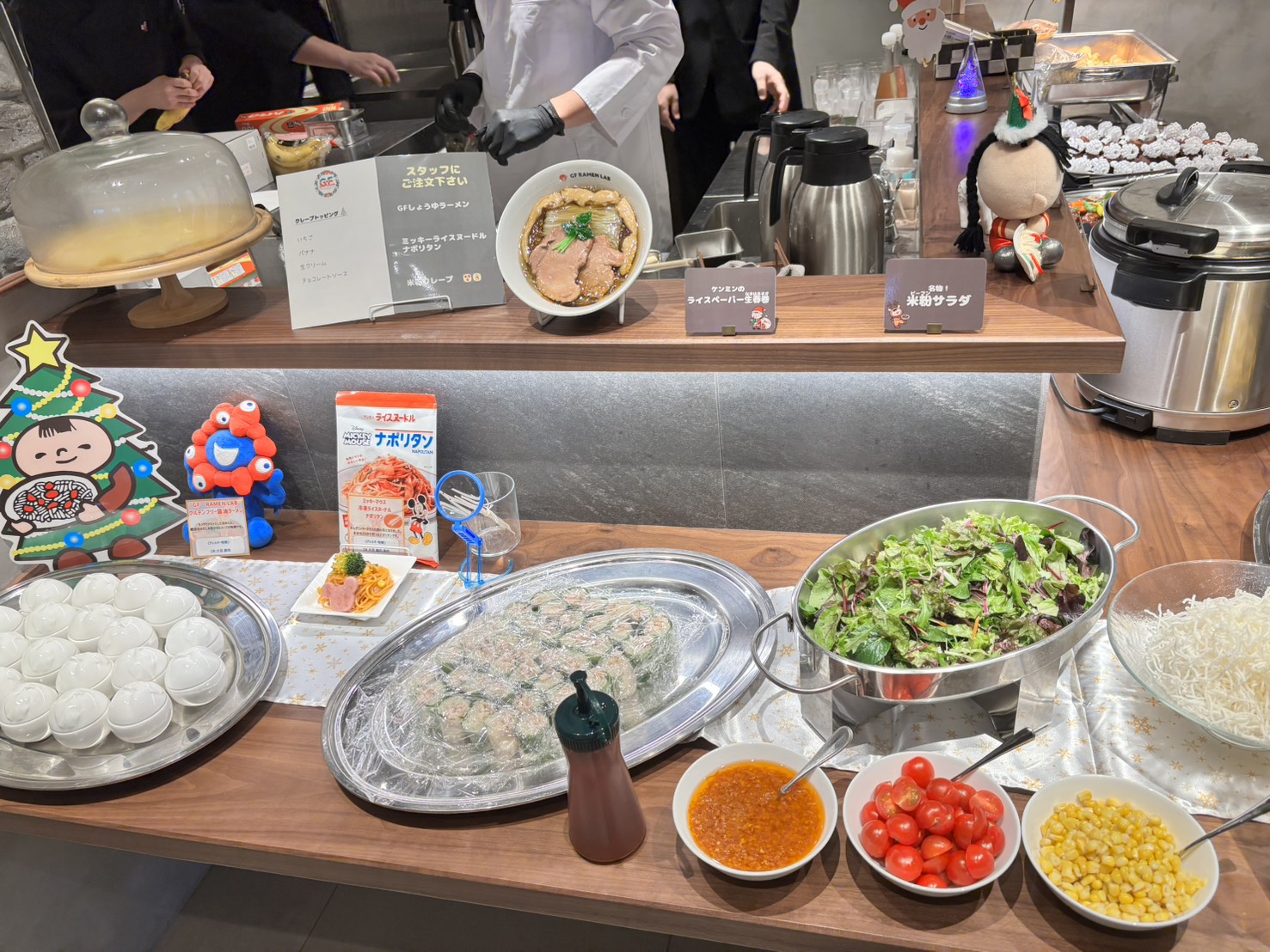 手羽先のローストチキンといったクリスマスらしいメニューや目の前で作るところを見ることができる米粉クレープの他、大阪・関西万博で大きな話題を呼んだ「GF RAMEN LAB」 で大人気だった「GFしょうゆラーメン」もご提供。“万博の味”としてご好評を頂きました。
