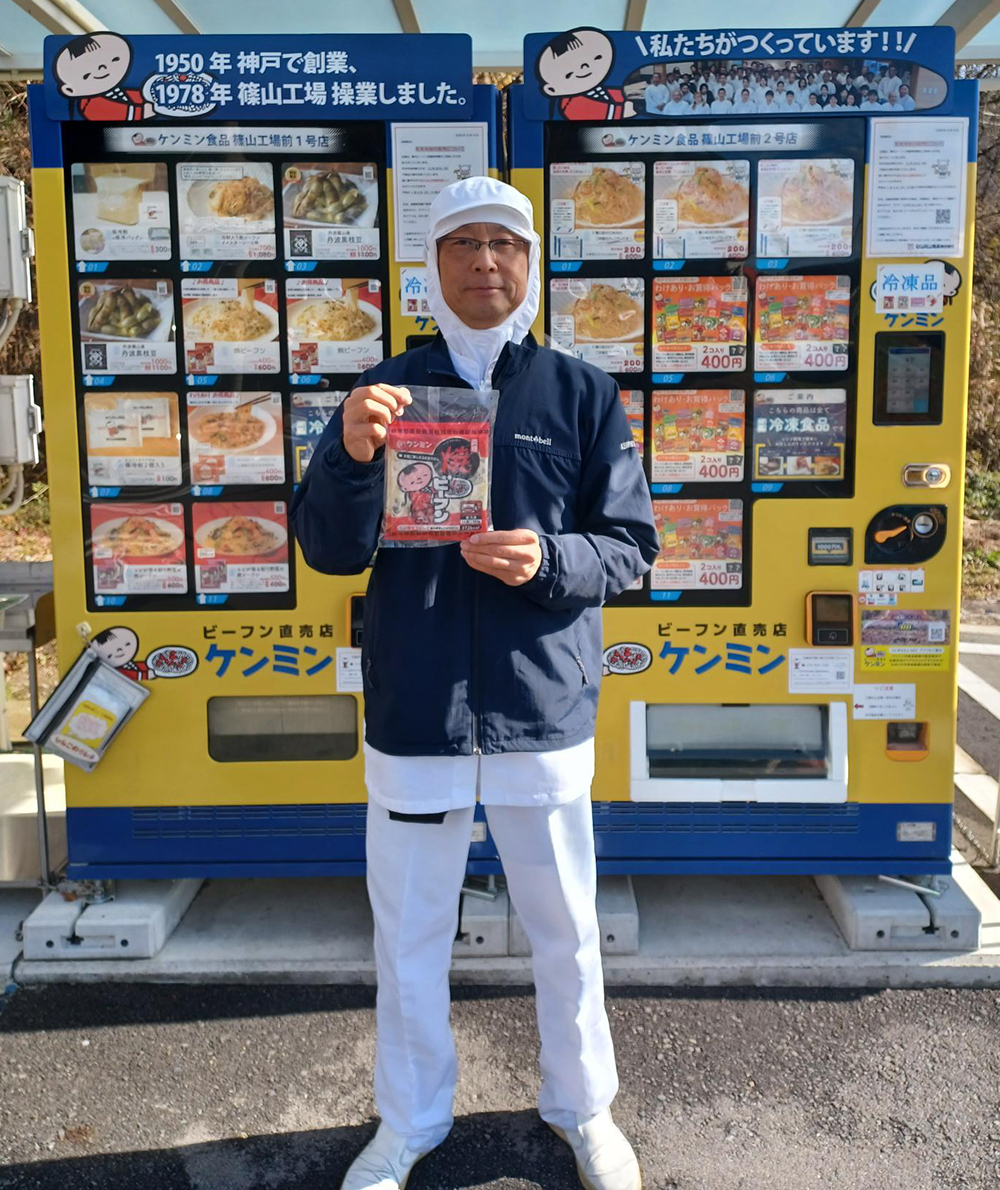 篠山工場で作るケンミンの冷凍ビーフンやはるさめを地域の皆さまに知っていただくとともに、いつでも簡単にご購入できる環境を整えたいと考え、篠山工場前に2021年10月28日に冷凍ビーフン自販機の1台目を設置しました。
