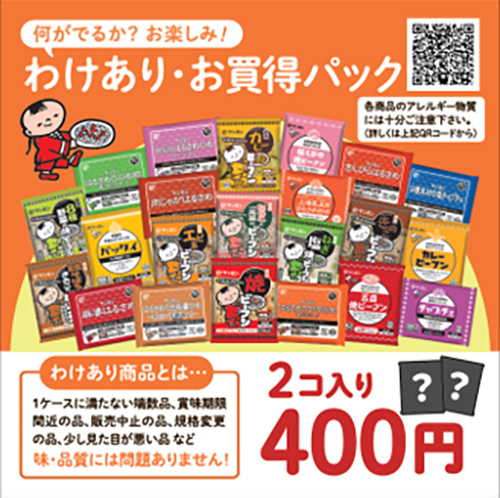 販売商品第1位は、篠山工場前の自販機でしか手に入らない、「何がでるか?お楽しみ!わけあり・お買得パック」です。