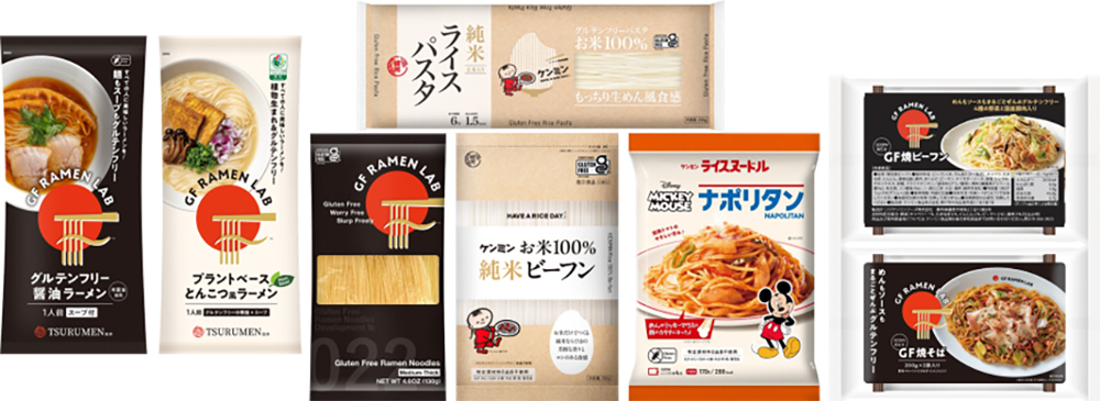 GF醤油ラーメン、プラントベースとんこつ風ラーメン、GF中華麺、GF焼そば(冷凍)、GF焼ビーフン(冷凍)、ミッキーマウス/冷凍ライスヌードルナポリタン、お米100%ビーフン、ライスパスタ -