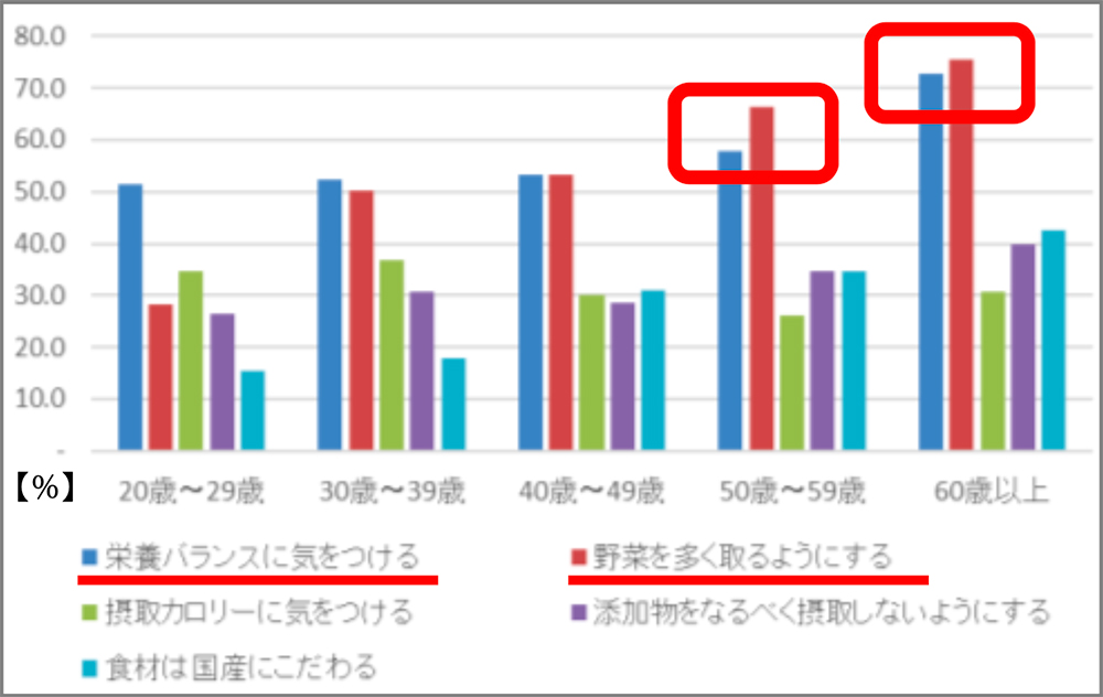 生協組合員への調査によると、普段の食事で気にしていることは「栄養バランス」や「野菜を多く摂ること」に強い関心があり、50代以上では特に健康を考えた食事への関心が高いことが明らかになりました。(右図①)