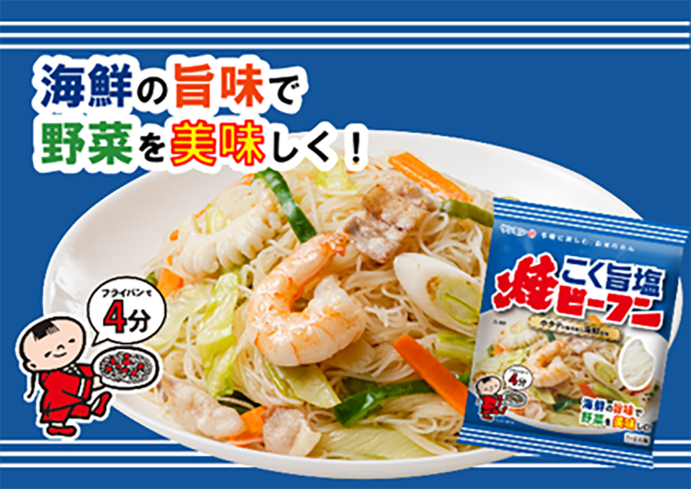 「野菜を手軽においしく食べられる」と近年需要が拡大している「ケンミン焼ビーフン」に、海鮮の旨味を効かせた塩味を新たに加え、家庭の食事作りでどうしてもマンネリになりがちな野菜料理の悩みにお応えします。