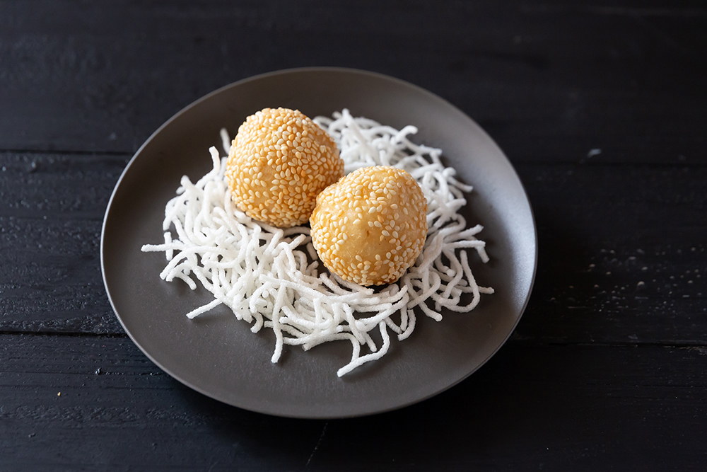米粉を使用した自家製の生地と、なると金時の甘みを活かした砂糖不使用の餡で仕上げた胡麻団子です。 -