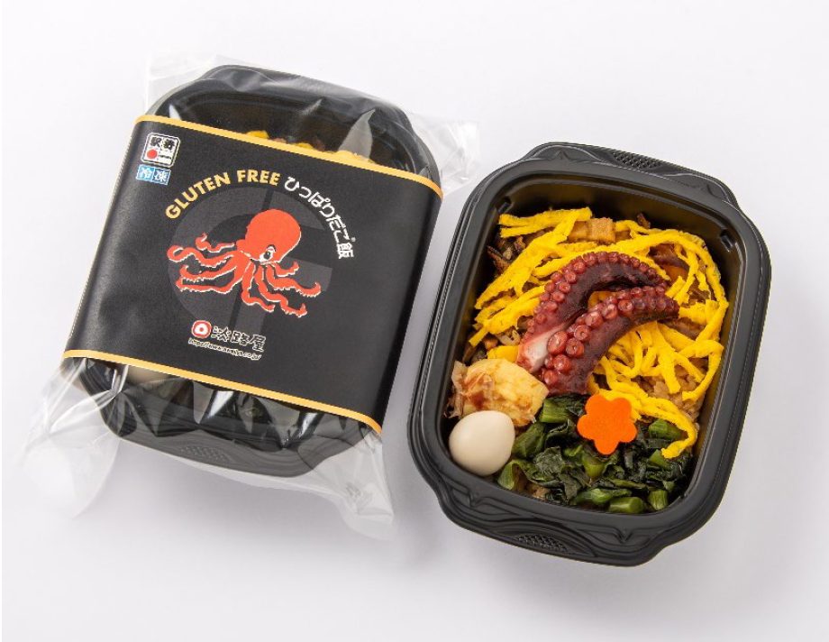 ひっぱりだこ飯」は、淡路屋の名物駅弁「ひっぱりだこ飯」をベースに、ケンミン食品と共同開発したグルテンフリー仕様の商品です。