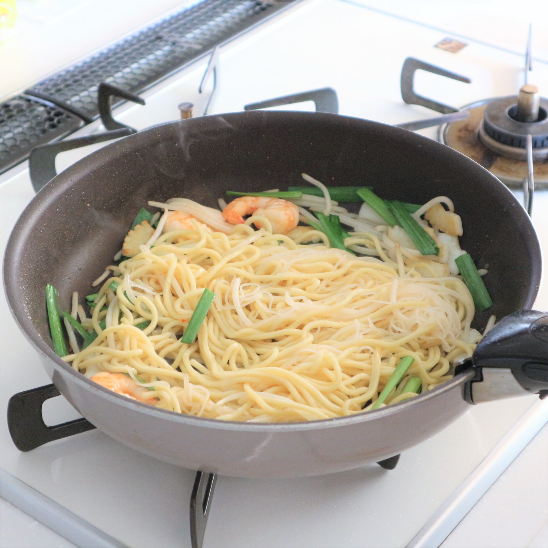 中華麺とビーフンの2種類を混ぜて作る、ぷりぷりの海老が入った海鮮焼きそばです。