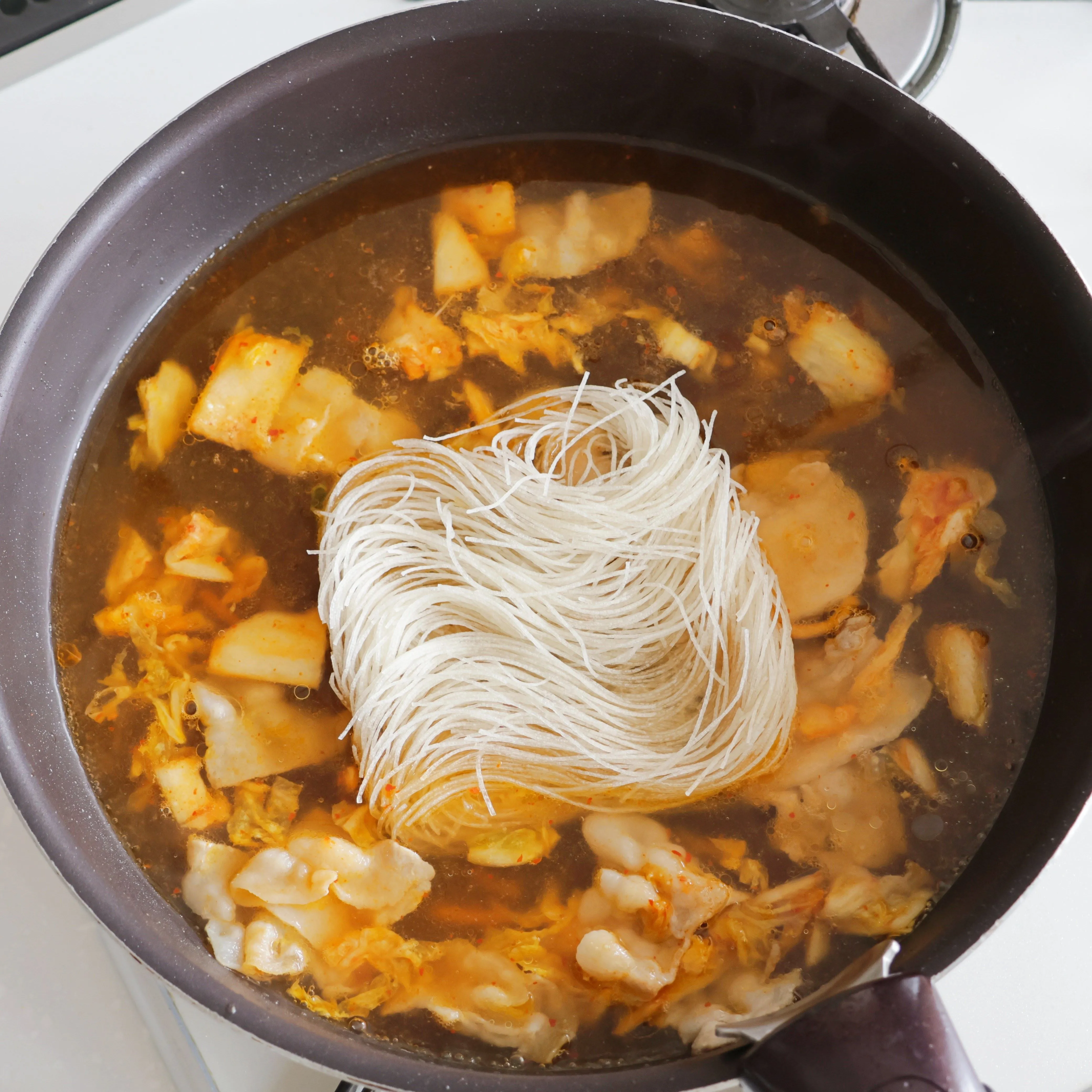 中国料理のプロ 脇屋友詞シェフのオリジナルレシピ!定番の豚キムチがスープビーフンに大変身☆豚肉とキムチのうまみと辛みが調味料の代わりになるので、調味料はシンプルなものでOKです!