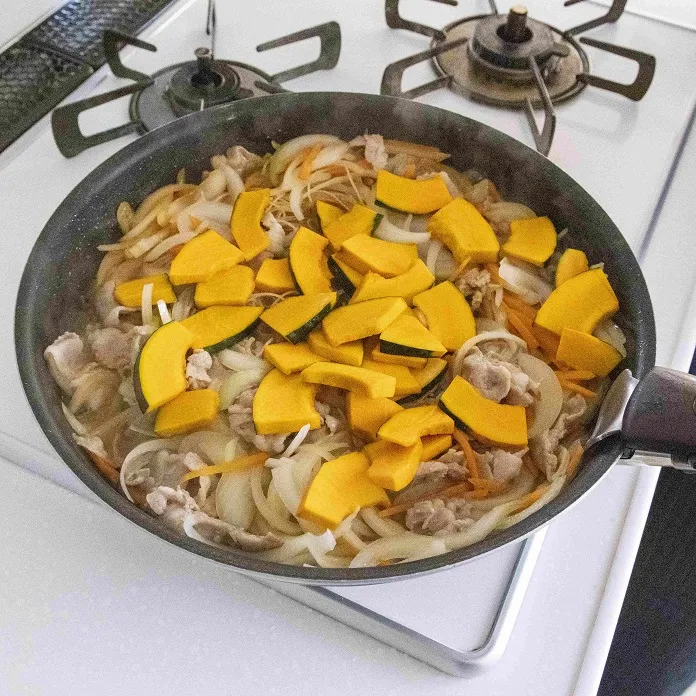 秋の味覚・甘味たっぷりのかぼちゃを使った、フライパンひとつでできる簡単大皿メニューです。