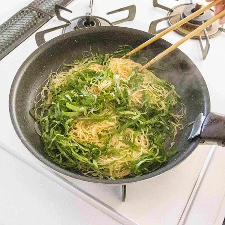 じゃこの塩気と旨みがビーフンに絡み、大葉の香りがふわっと広がる、和テイストの一皿。