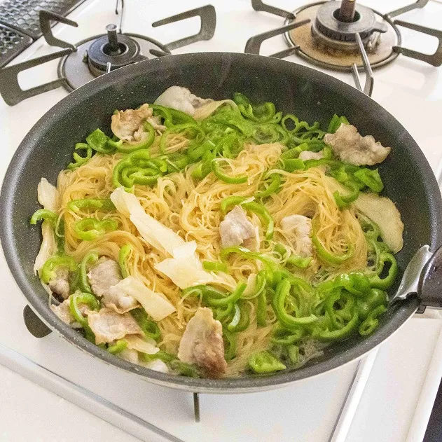 ピリっと香る!新生姜とピーマンの焼ビーフン