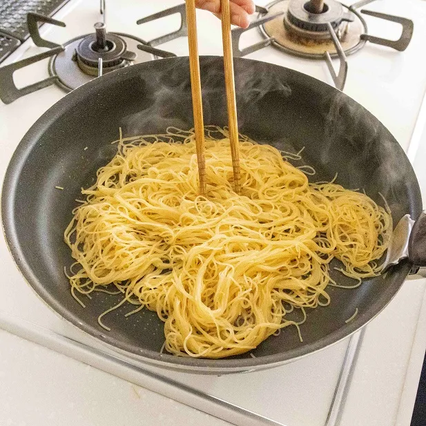 シンプルなのに奥深い味わいは、焼ビーフンの鶏だし醤油味とトマトのうま味が決め手。