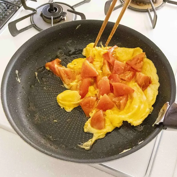 ふんわり半熟の卵と、じゅわっと果汁があふれる甘酸っぱいトマト。