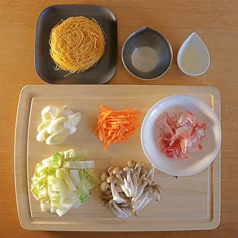 冷蔵庫で余ってしまった野菜を焼ビーフンと炒め合わせるだけで、手軽に野菜たっぷりの一皿が出来上がります。