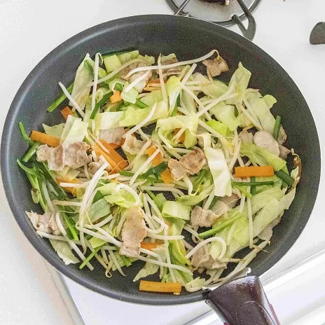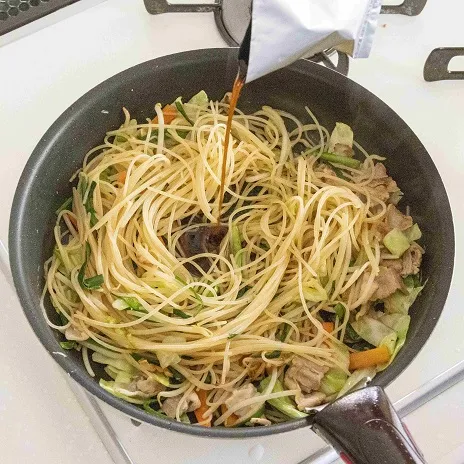 余熱でめんが軟らかくなりますので、めんを加えあとは、さっと炒める程度でOK!