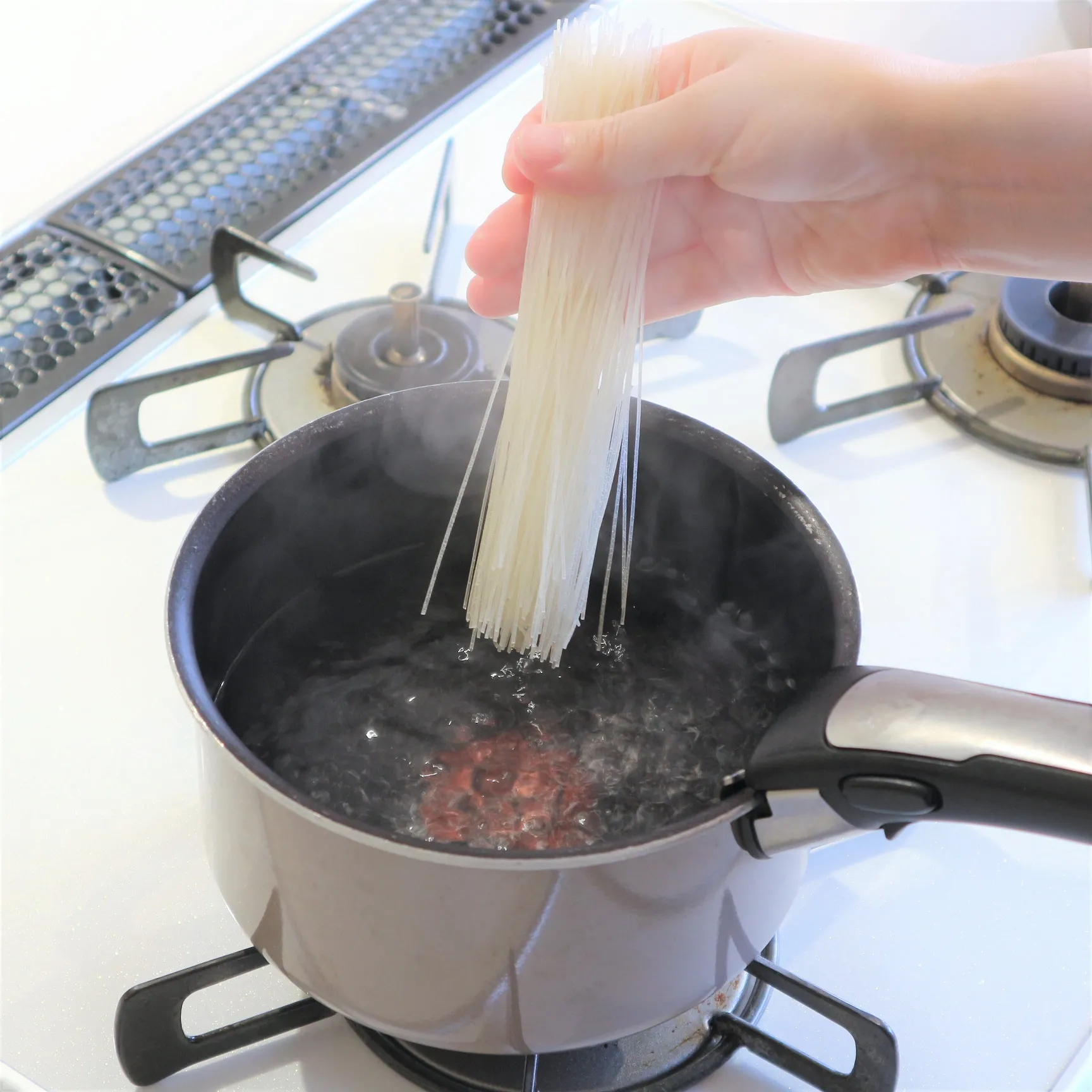 ①沸騰したお湯にビーフンを入れ、3分ふつふつとした火加減でゆでる。ザルに取り、流水で洗いながらしっかり冷やす。