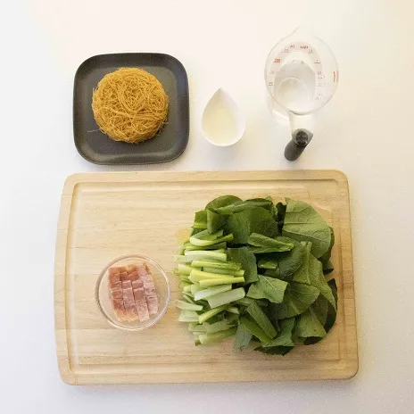 ベーコンは細切りにし、小松菜は4~5cm幅に切る。