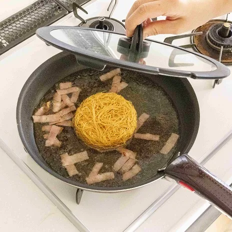 1分30秒後ふたを取ってビーフンを裏返して軽くほぐす。