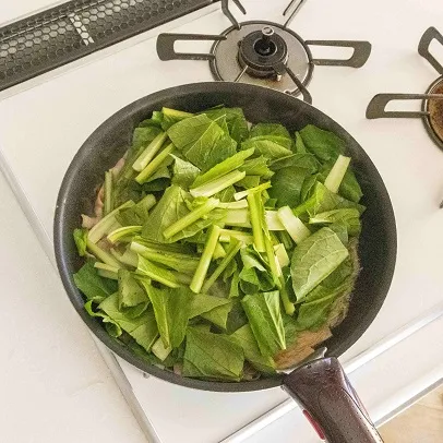 小松菜を加えたら 再びふたをし、1分30秒加熱する。
