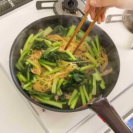 小松菜とベーコンの焼ビーフン