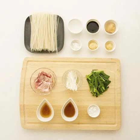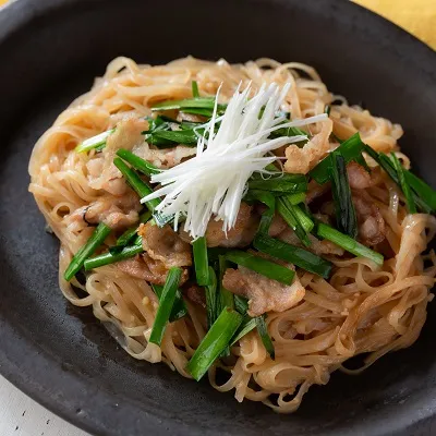 もっちりしたお米のめんに、ジューシーな豚肉のコクとにんにくの香りがよく合います♪