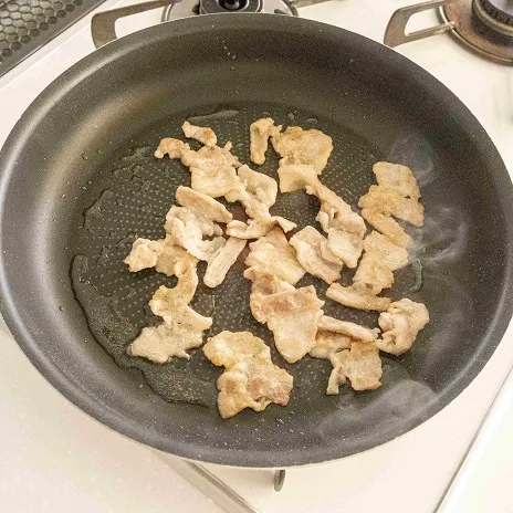 フライパンにねぎ油(大さじ1)を熱し、豚ばら肉を焼く。【弱火】