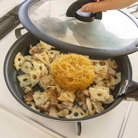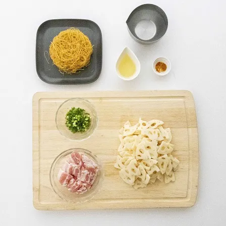 香ばしく焼き上げたれんこんの風味がビーフンにからみ、シンプルながら滋味深いひと皿に仕上がります。