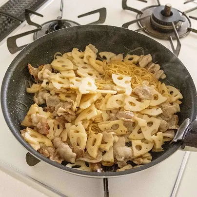 れんこんを一節まるごと使って、シャキシャキ食感とほっくりした甘みを楽しむ焼ビーフン。