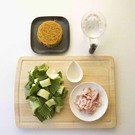 チンゲン菜は細めに切ることで、ビーフンと混ざりやすくなります。