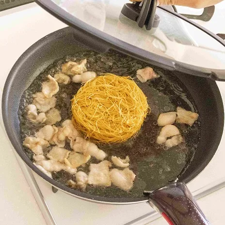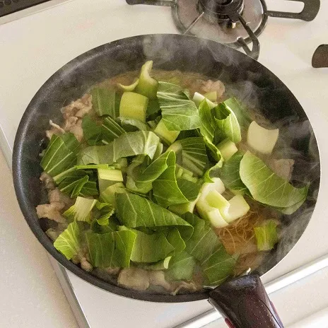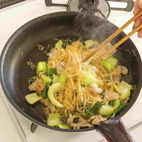 加熱途中でチンゲン菜を加えることで、シャキシャキとした食感を残しつつも、チンゲン菜にビーフンの「だし」をしみ込ませることができます!